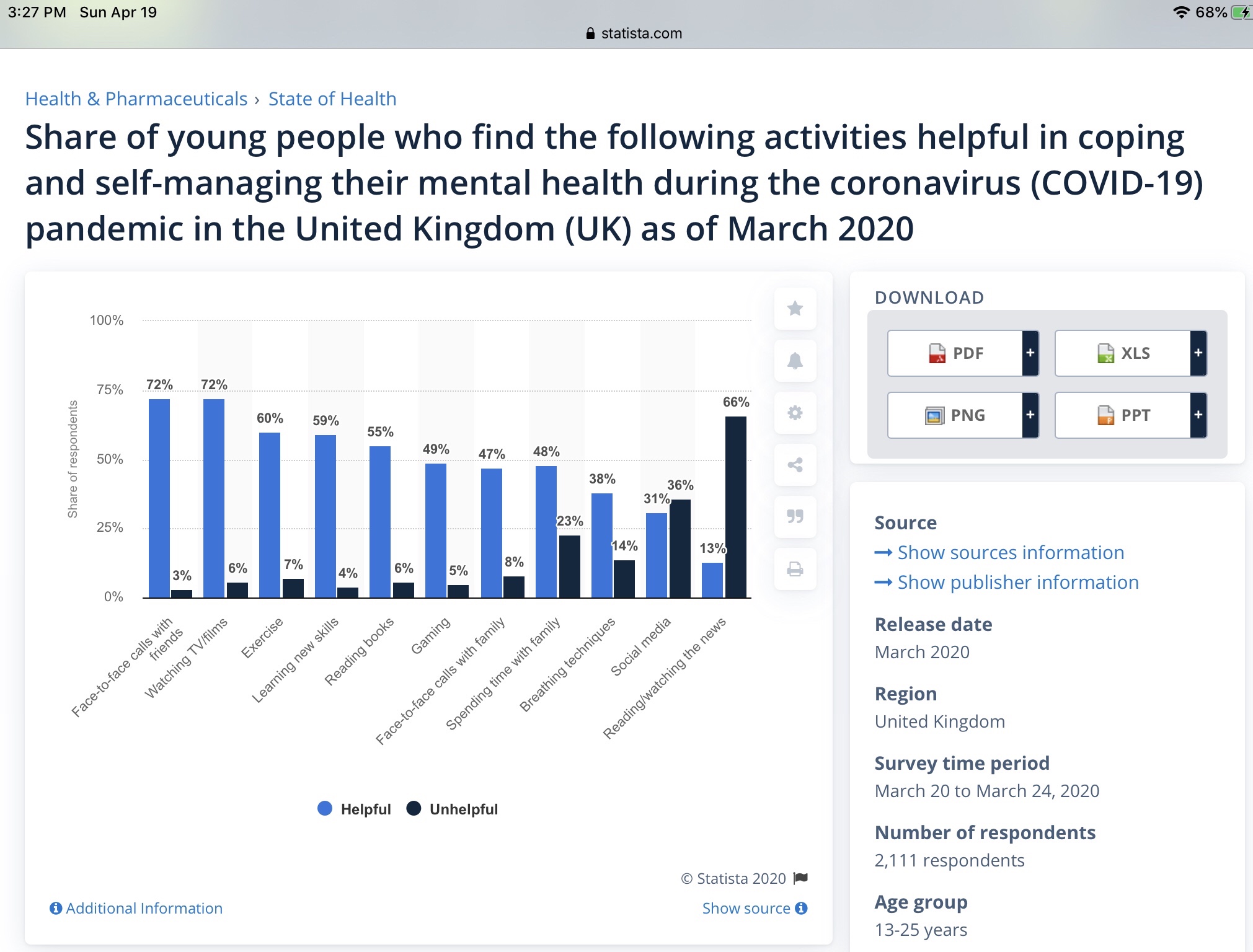 Stat #2: This is one of my favourites – they asked young adults – 13-25 – what activities they found helpful – and not helpful while self-isolating. Watching the news was the LEAST helpful – and no where in the list are things like – playing bridge, cleaning their house, making their bed, doing crafts, sleeping … But no surprise – these are kids!