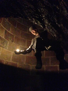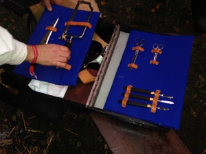 1:33 PM – we’re fast – Aprons on (don’t want to get our uniforms dirty), equipment ready – we bring the patient nearer to the spectators so that they can get a good view. 3 guys hold him down while he bites on a piece of wood (more to shut him up then to relieve the pain – if he gets much noisier the team holding him down have been told to hit him hard in the head. The noise is annoying the doctors). Personally I think the thrashing is most annoying. I guess a musket ball in the leg must really hurt.